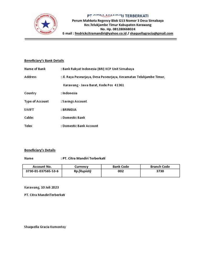 Name of Bank : Bank Rakyat Indonesia (BRI) KCP Unit Sirnabaya