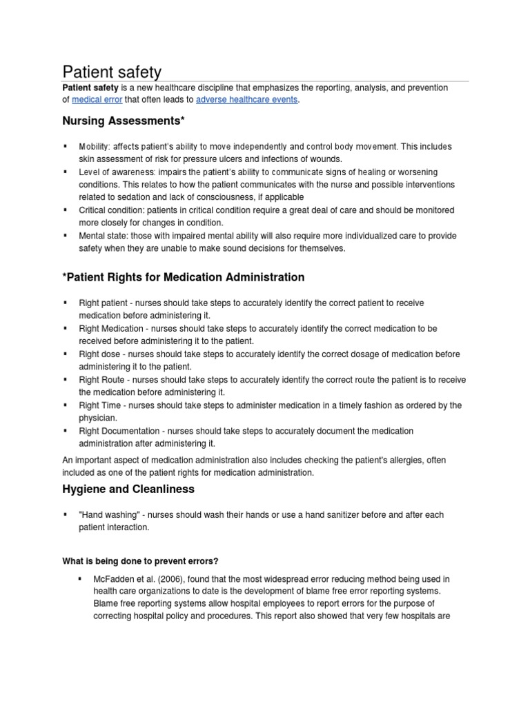 For example, patients should understand what procedure they had and the expected pain level after analgesic medications have been administered or after non-pharmacological measures have been taken. Knowing this standard, patients can be more active in their pain management. 4. Physical therapy, exercise programs, speech therapy, and occupational therapy. These services, while helping patients recover, may also evaluate safety needs of patients before being discharged. For example, physical therapists providing information about building strong muscles and bones to prevent falls at home, or speech therapists teaching swallowing techniques to prevent choking. A home evaluate may check home safety. It is the responsibility of nurses to inform patients about these resources and to collaborate with these other disciplines to ensure patient safety. 5. Electronic medical records. Intranet connects health care workers throughout the hospital concerning the patients electronic medical record (EMR), patient status, allergies, test results etc. to ensure patient safety throughout the hospital. Health care workers are able to access the patient record for better communication of information. 6. Libraries Hospital libraries are a great resource for patients and health care workers. They are conveniently located in the hospital and provide a wide range of sources, from books and journal articles to the internet.