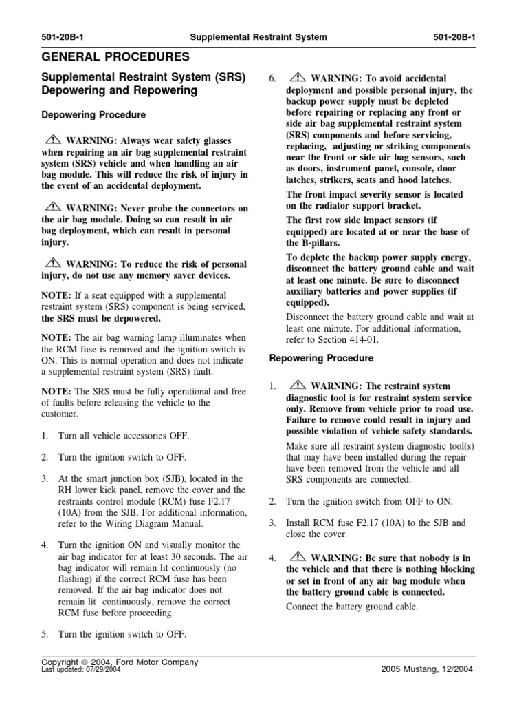 Air bag warning lamp illuminates when the RCM fuse is removed and the ignition switch is on. Air bag indicator will remain lit continuously (no flashing) if the correct RCM fuse has been removed. The backup power supply must be depleted before repairing or replacing any front or side air bag Supplemental Restraint System (SRS) components.