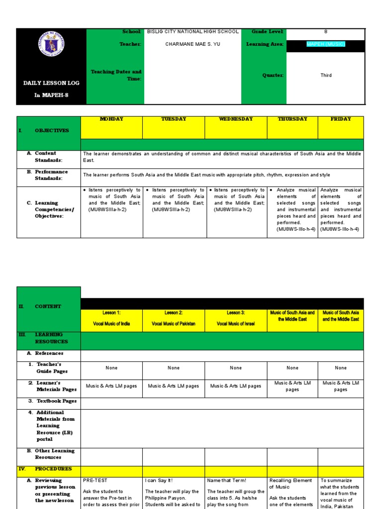 MAPEH 8 Daily Lesson Log: Music of South Asia