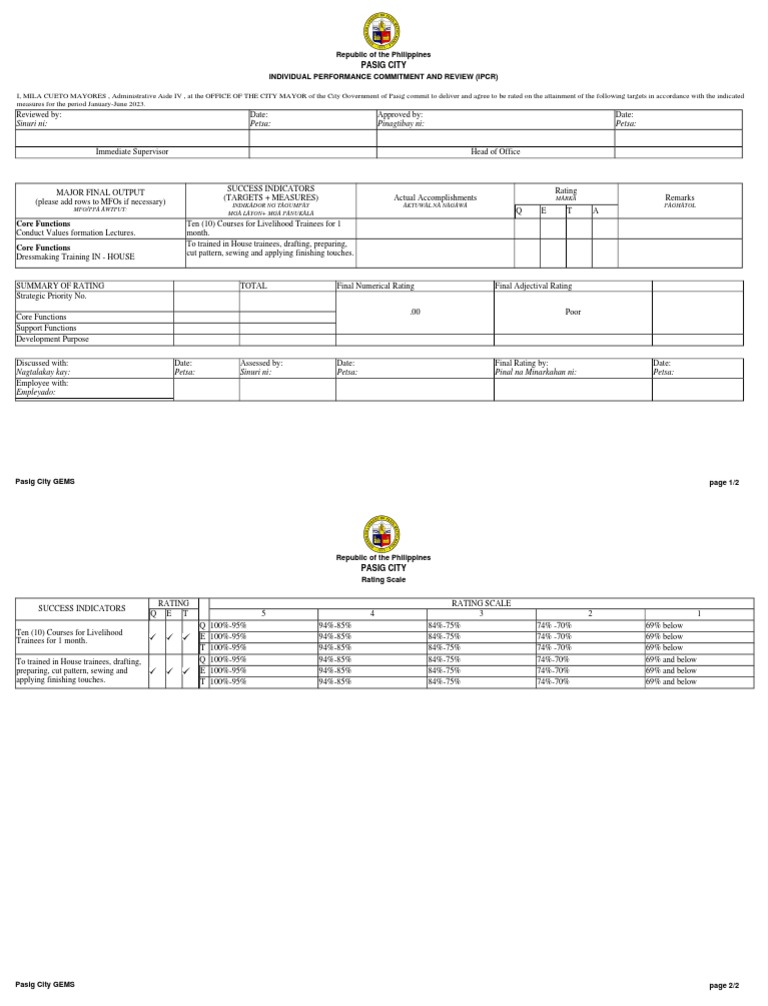 I, MILA CUETO MAYORES , Administrative Aide IV , at the OFFICE OF THE CITY MAYOR of the City Government of Pasig commit to deliver and agree to be rated on the attainment of the following targets in accordance with the indicated