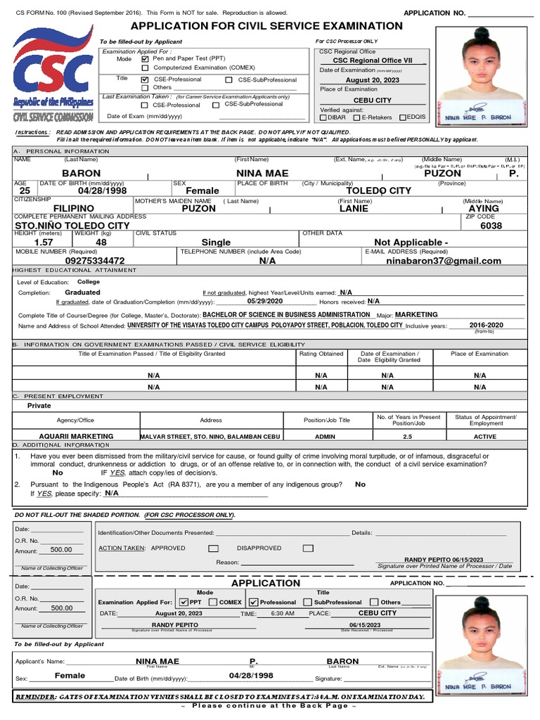CS FORM No. 100 (Revised September 2016). This Form is NOT for sale. Reproduction is allowed. APPLICATION NO.