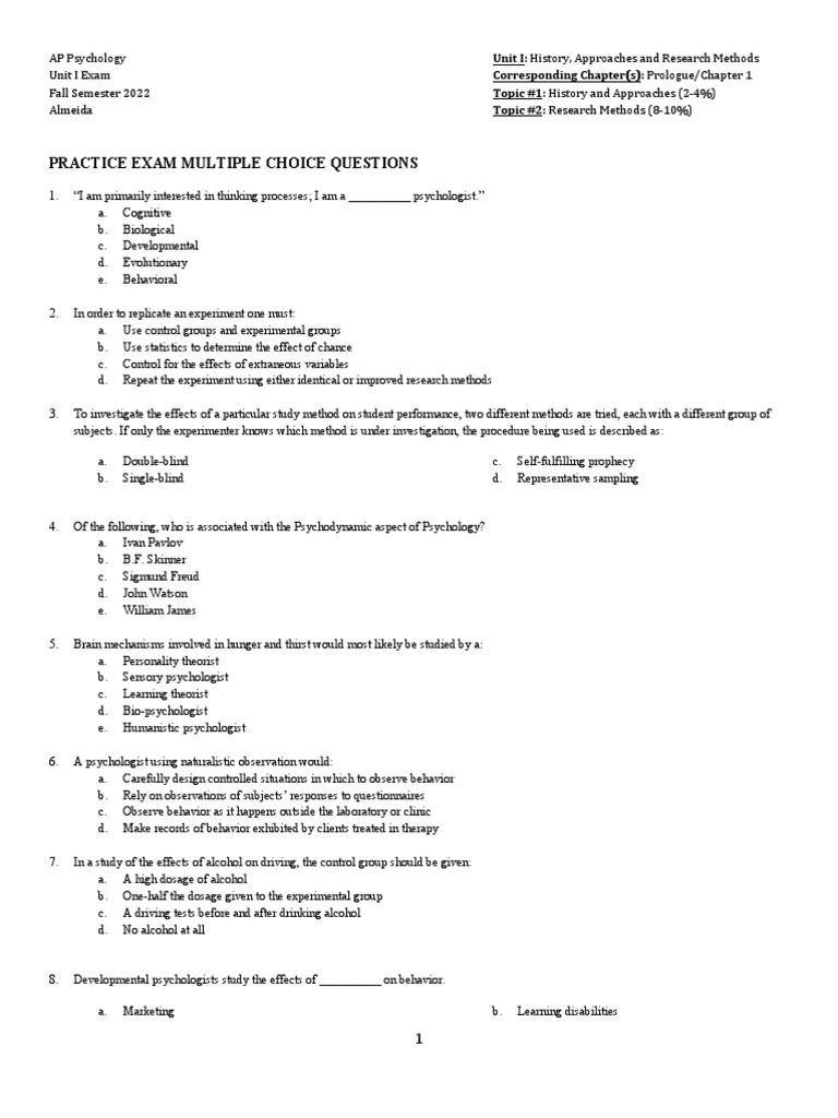 AP Psychology Unit I Practice Test (No Answers) UPDATED 2