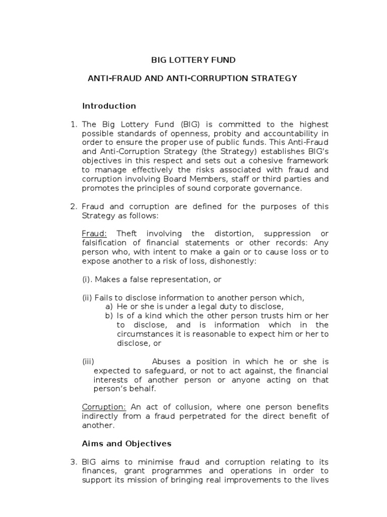 BIG LOTTERY FUND ANTI FRAUD AND ANTI CORRUPTION STRATEGY and fraud awareness is emphasised within assessment and grant management courses. generic