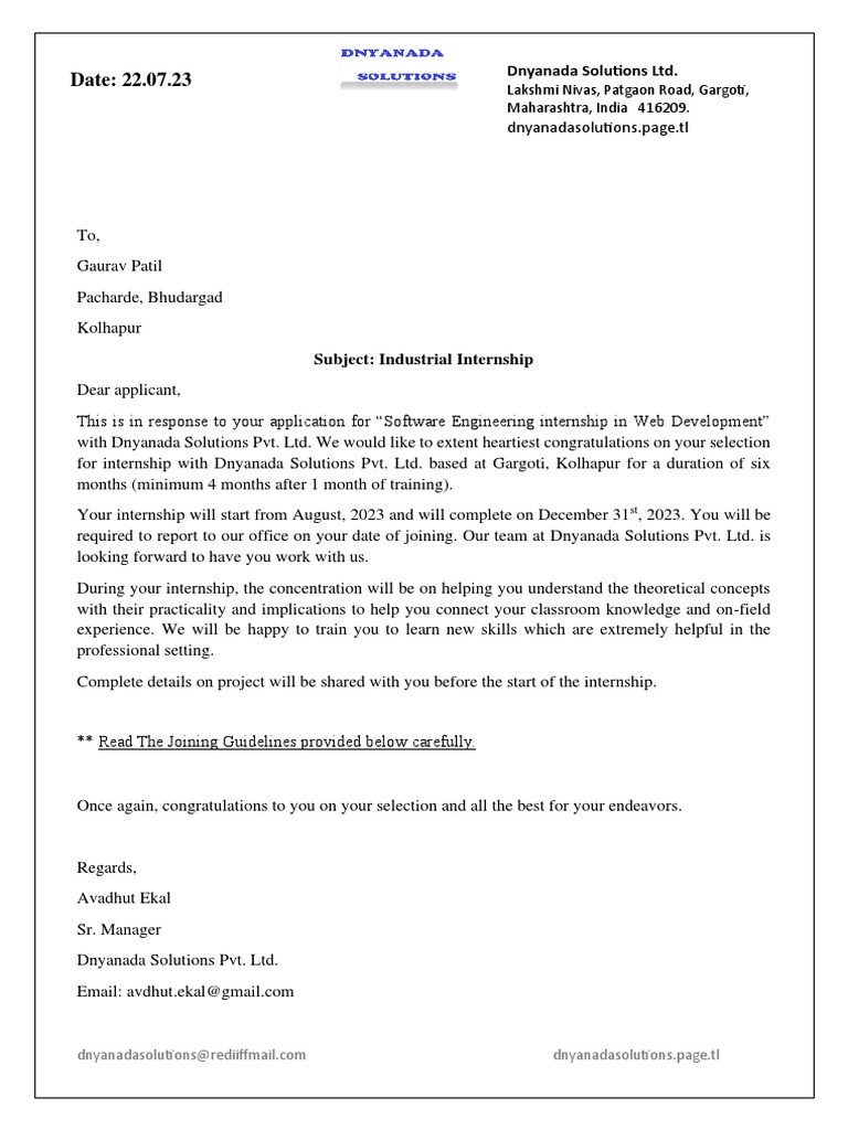 with Dnyanada Solutions Pvt. Ltd. We would like to extent heartiest congratulations on your selection