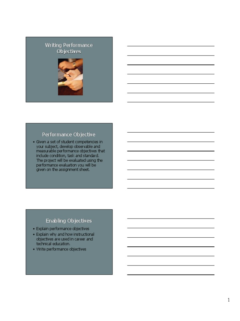 Explainperformanceobjectives Explainwhyandhowinstructional objectivesareusedincareerand technicaleducation. Writeperformanceobjectives