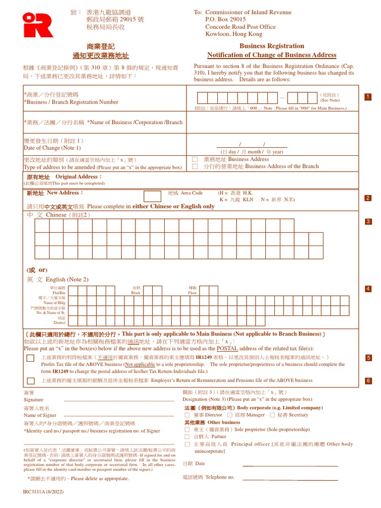 1. 變更發生日期前的通知恕不接受。業務地址必須是香港 1. Advance notice will not be accepted. Business address