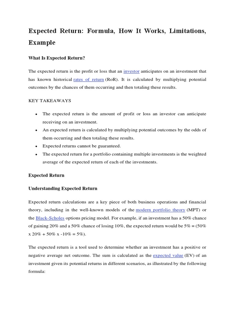 • An expected return is calculated by multiplying potential outcomes by the odds of