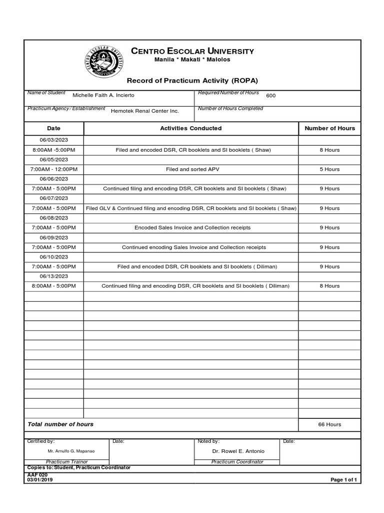 7:00AM - 5:00PM Filed and encoded DSR, CR booklets and SI booklets ( Diliman) 9 Hours