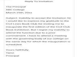Reply to Book Exhibition Invitation: Provides a template for replying to a book exhibition invitation, expressing inability to attend due to prior commitments.