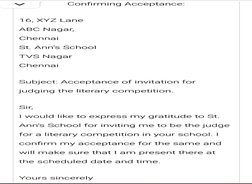 Accepting Invitation for Literary Competition: Drafts a letter accepting an invitation to judge a literary competition, confirming attendance.