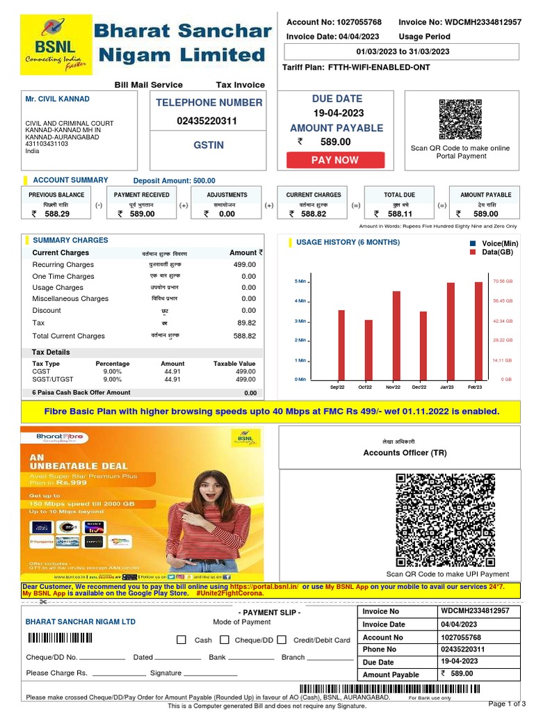 BHARAT SANCHAR NIGAM LTD Mode of Payment Invoice Date 04/04/2023