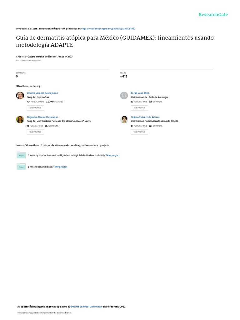 This document provides information about a new guide for atopic dermatitis in Mexico (GUIDAMEX) that was created using the ADAPTE methodology. The GUIDAMEX guidelines were developed by 38 authors from hospitals and universities in Mexico. It is published in the January 2023 issue of Gaceta Medica de Mexico. The guidelines aim to standardize the diagnosis and treatment of atopic dermatitis in Mexico based on international recommendations and the experience of Mexican experts. The document provides details on the authors and institutions involved in developing the GUIDAMEX guidelines.