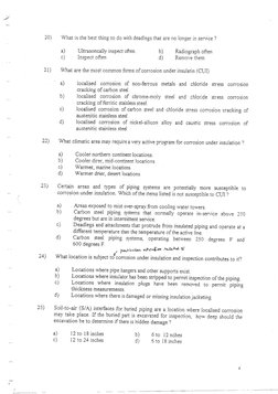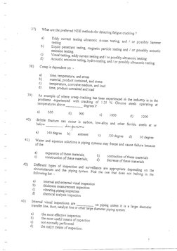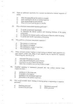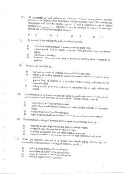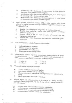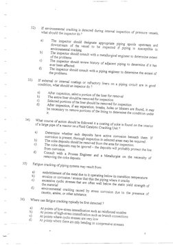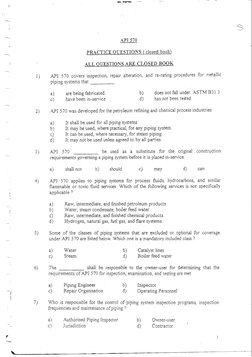API 570 Practice Questions: Contains practice questions regarding inspection, repair, and re-rating procedures for metallic piping systems under API 570 guidelines. Answer Key for API 570: Provides the answer key for the API 570 practice questions, listing correct answers by question number. Practice Questions on ASME Code V: Includes questions related to non-destructive testing and inspections reflecting ASME Code V standards. Answer Key for ASME Code V: Lists the answers for the ASME Code V practice questions, formatted with question numbers and correct choices. ASME B31.3 Practice Questions: Contains questions that reflect compliance and engineering standards as per ASME B31.3 guidelines. Answer Key for ASME B31.3: Provides answer key for ASME B31.3 practice questions, often used to self-check accuracy of previous answers. Practice Questions on ASME B16.5: Presents questions focusing on topics relevant to flanges and fittings under ASME B16.5 specifications. Answer Key for ASME B16.5: Lists the correct answers for practice questions under ASME B16.5, organized by question number. ASME B31.3 Practice Questions (Valve Section): Includes practice questions specifically related to the interpretation of valve sections within ASME B31.3. Answer Key for ASME B31.3 (Valve Section): Answer key specific to the valve section practice questions under ASME B31.3, covering the associated valve topics. (>