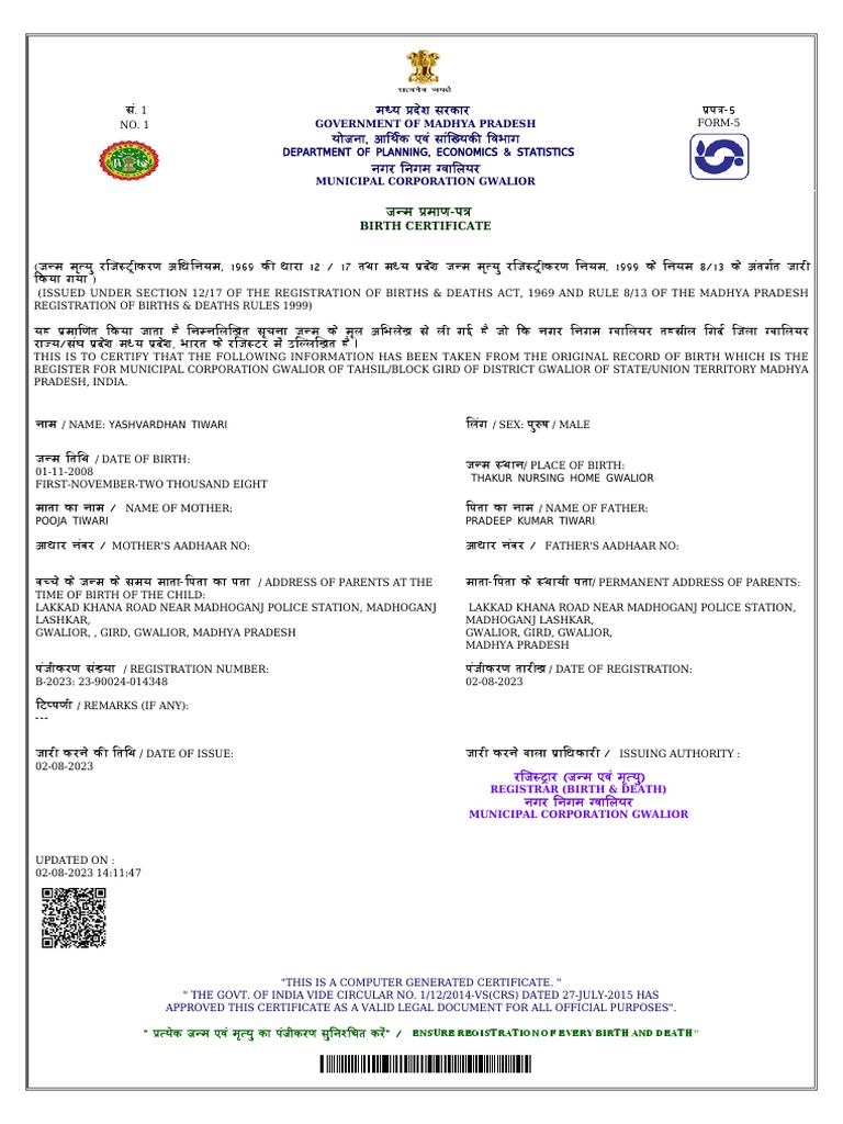 (ISSUED UNDER SECTION 12/17 OF THE REGISTRATION OF BIRTHS & DEATHS ACT, 1969 AND RULE 8/13 OF THE MADHYA PRADESH