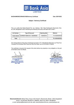 This is to certify that Global Brandh Put. Lid., Address: 19/2, West Panthapath Dhanmondi, Dha-
