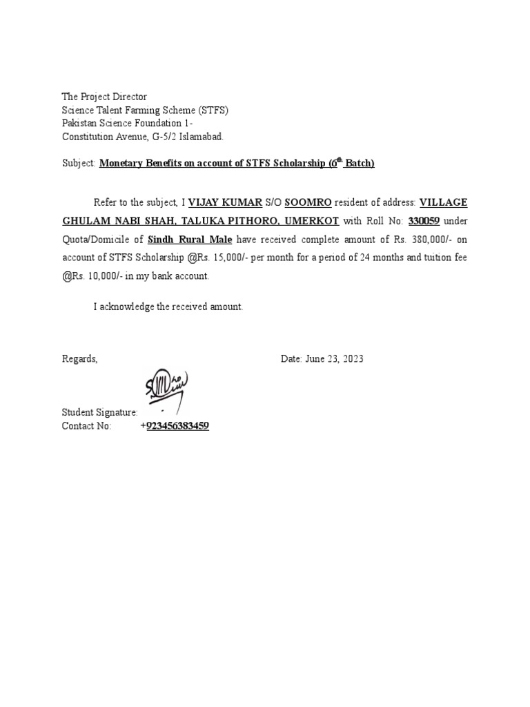 Subject: Monetary Benefits on account of STFS Scholarship (6th Batch)