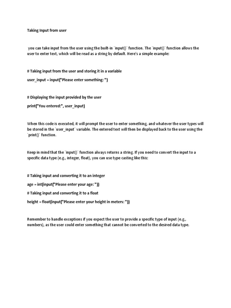 Remember to handle exceptions if you expect the user to provide a specific type of input (e.g.,