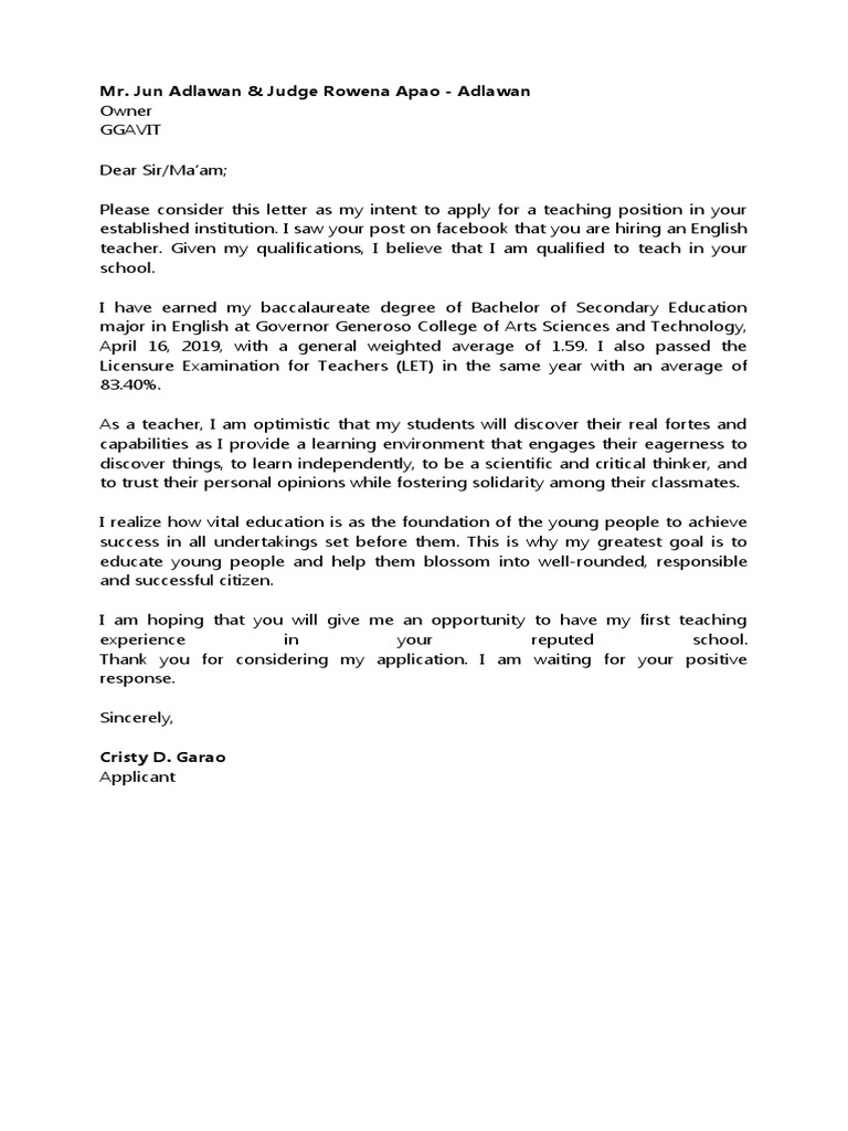 Please consider this letter as my intent to apply for a teaching position in your