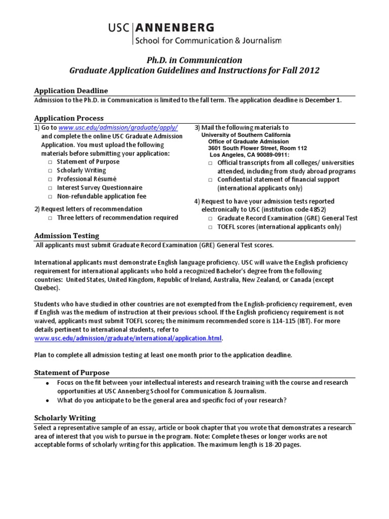 1) Go to www.usc.edu/admission/graduate/apply/ and complete the online USC Graduate Admission Application. You must upload the following materials before submitting your application: Statement of Purpose Scholarly Writing Professional Rsum Interest Survey Questionnaire Non-refundable application fee 2) Request letters of recommendation Three letters of recommendation required 3) Mail the following materials to