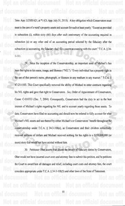 Petition for Termination of Conservatorship: This section introduces the petition to terminate conservatorship, providing factual background regarding Michael Oher's upbringing and his relationship with the Tuohy family. Procedural Background and Arguments: Outlines the procedural history and arguments related to the conservatorship, including events that occurred post-establishment. Request for Injunctive Relief: Details the request for injunctive relief against the respondents, highlighting legal citations and precedents. Conclusion and Prayer for Relief: Summarizes the petitioner's requests, seeking relief and termination of conservatorship, concluding with legal formalities. Official Definitions and Instructions: Defines key terms and provides instructions relevant to the legal proceedings surrounding the conservatorship. Interrogatories: Presents a series of interrogatories aimed at gathering information pertinent to the case, directed at various parties involved. Certificate of Service: Certifies the service of documents to the parties involved, ensuring all procedural requisites are met. This our assigned