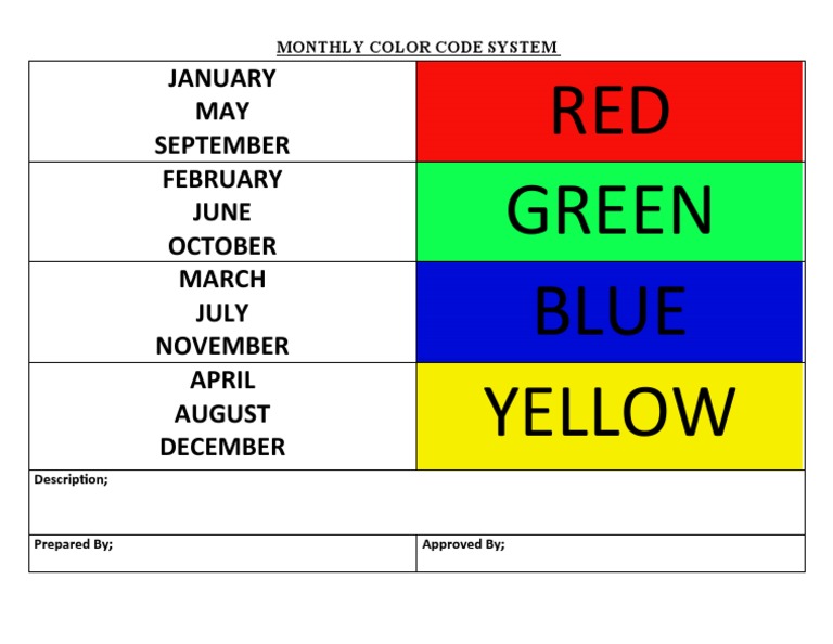 This document outlines a monthly color code system where January, May, and September are red, February, June, and October are green, March, July, and November are blue, and April, August, and December are yellow.