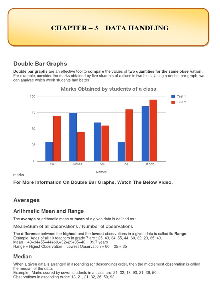 For example, consider the marks obtained by five students of a class in two tests. Using a double bar graph, we