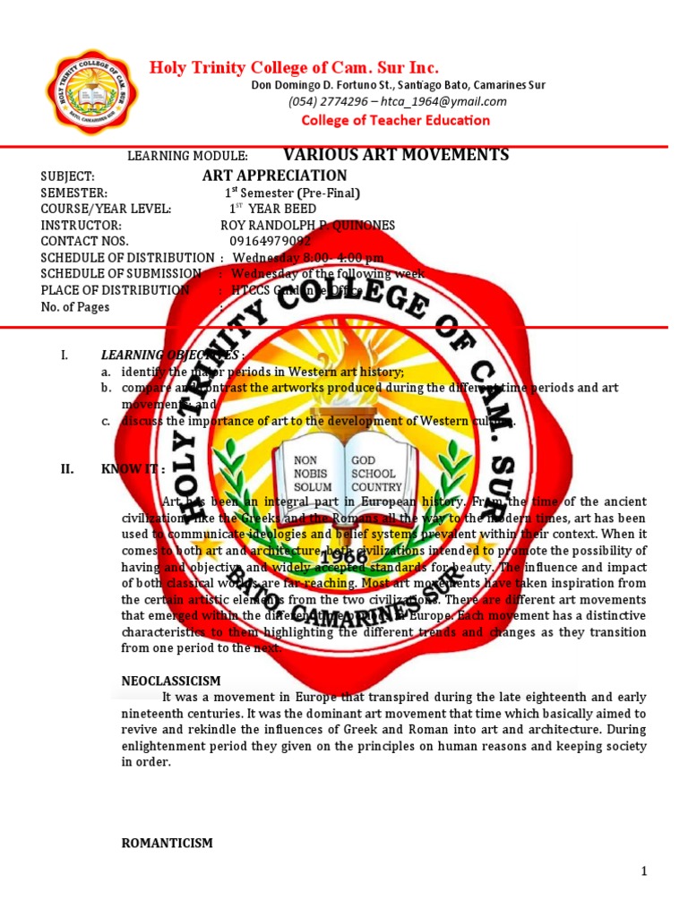 LEARNING MODULE: VARIOUS ART MOVEMENTS