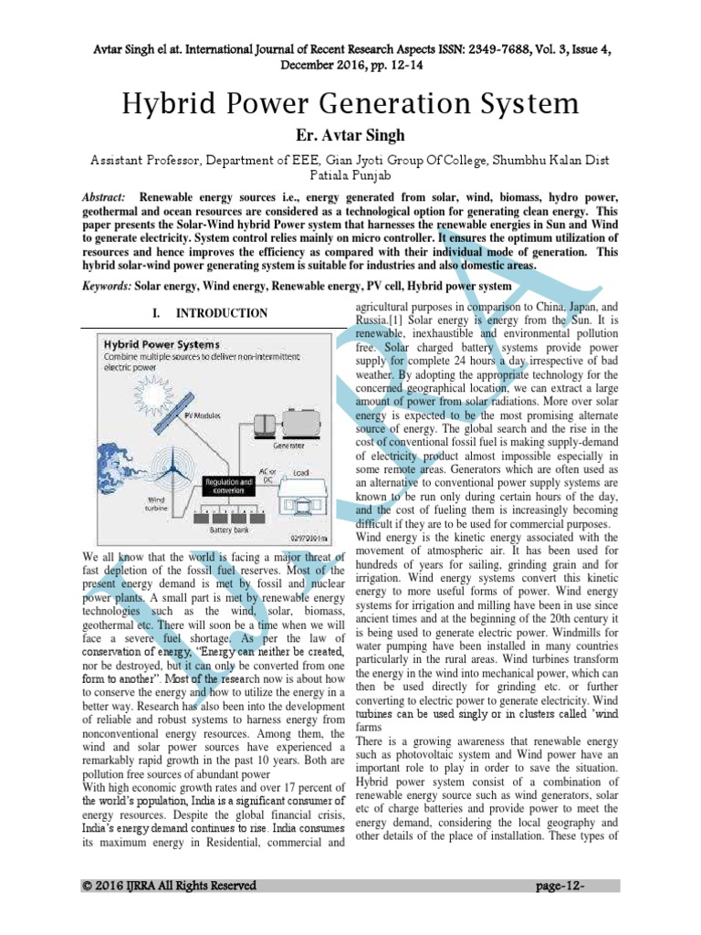 hybrid systems has grown as they appear to be the right hybrid energy supply system. The Solar PV wind hybrid