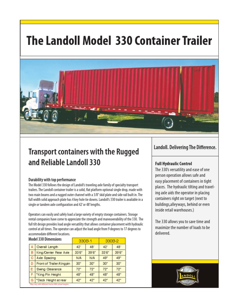 The Landoll 330 was the first container transport trailer that was truly designed for the application of ground loading and unloading empty containers used for short term storage. The 330s versatility allows the operator to load and transport storage container lengths from 10 to 45 long. The trailer has twelve tie down locations on the main deck and six on the approach plate. The standard 12,000 lb. winch has 85 of cable that allows the operator to reach really tough loads. The standard equipment list goes on...255/70R 22.5 tires, hub pilot wheels with outboard brake drums, 16.5 x 7 full air brakes with spring brakes, ABS 2S1M on the single axle, and 4S2M on the two axle model. When looking for container trailers, a Landoll 330 will provide you with more standard features than any other trailer on the market. Landoll delivers the difference with superior manufacturing techniques, more standard features and the highest resale value in the the industry today.