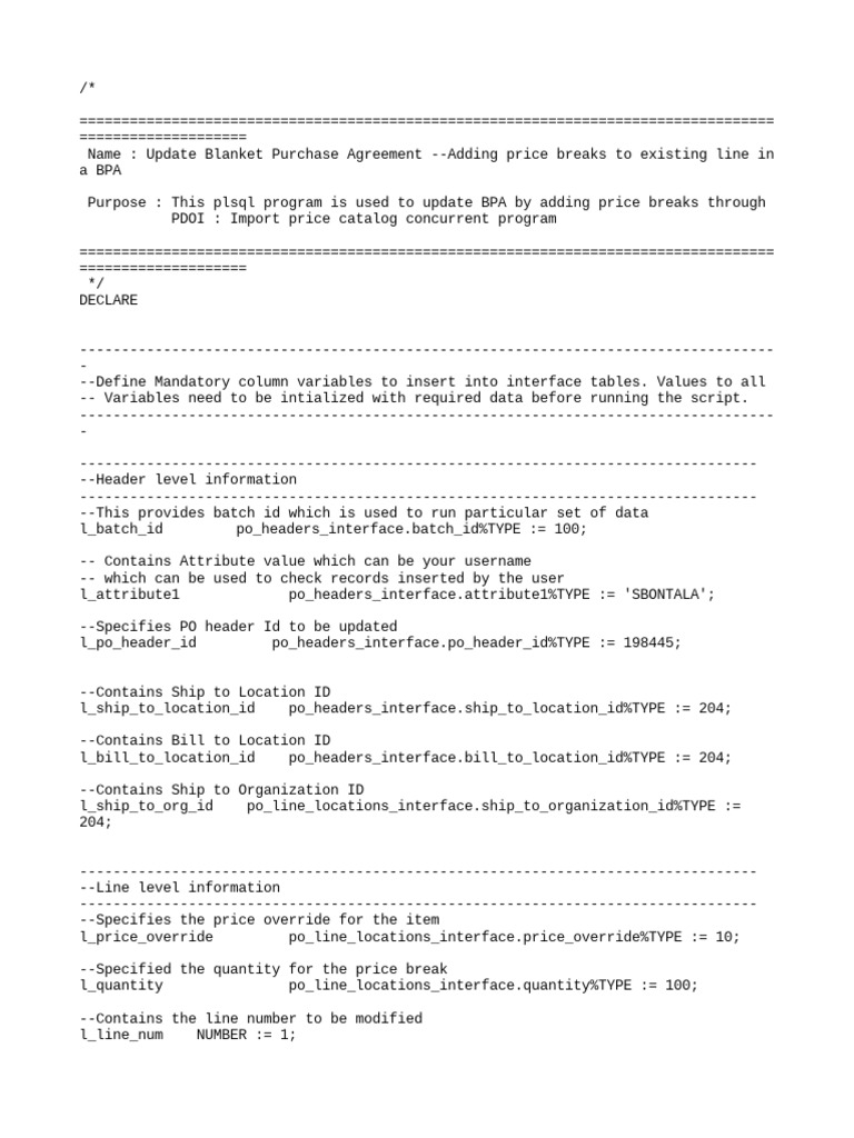 Purpose : This plsql program is used to update BPA by adding price breaks through