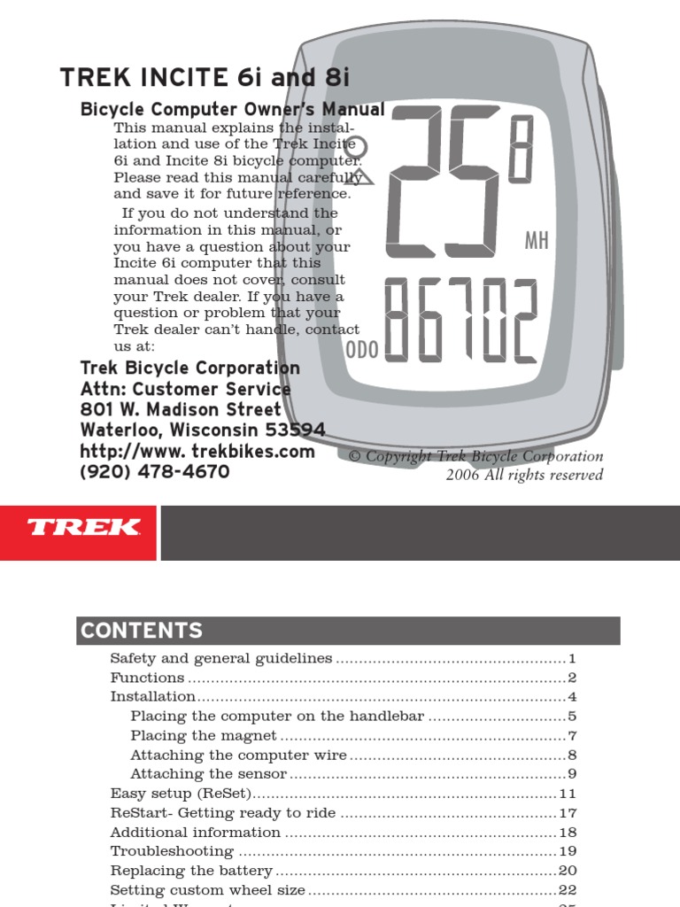 This manual explains the installation and use of the Trek Incite 6i and Incite 8i bicycle computer. Please read this manual carefully and save it for future reference. If you do not understand the information in this manual, or CLK you have a question about your TME Incite 6i computer that this manual does not cover, consult AVG your Trek dealer. If you have a MAX question or problem that your TRP Trek dealer cant handle, contact us at: ODO