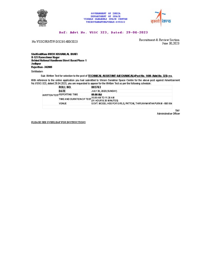 With reference to the online application you had submitted to Vikram Sarabhai Space Centre for the above post against Advertisement