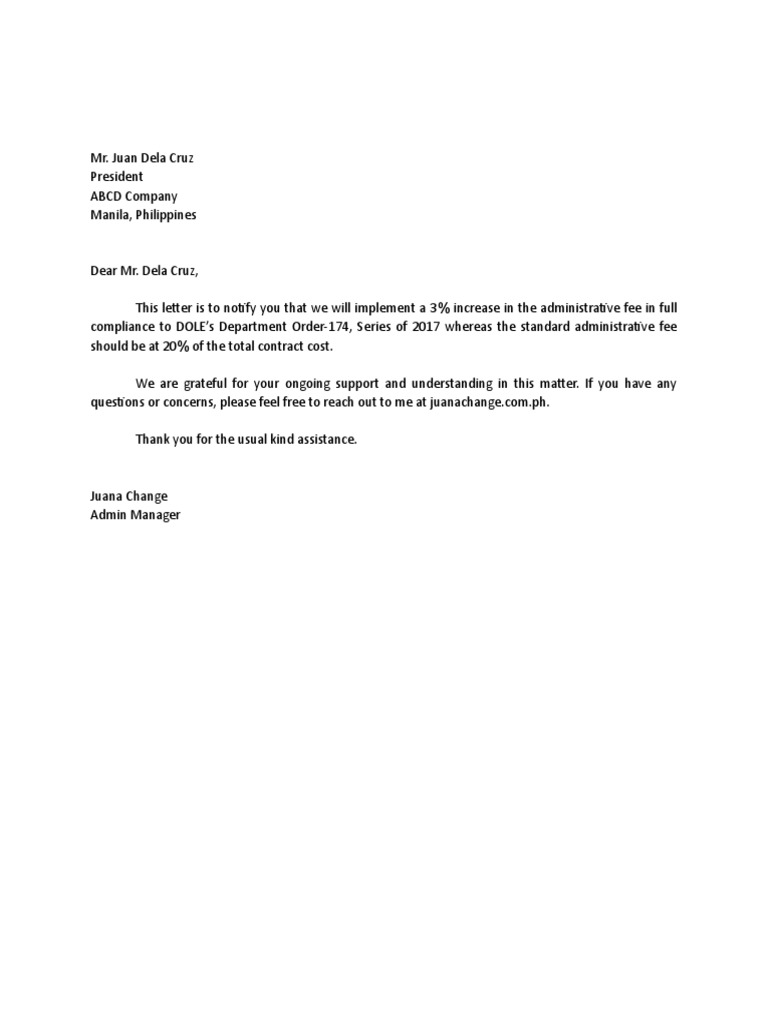 This letter is to notify you that we will implement a 3% increase in the administrative fee in full