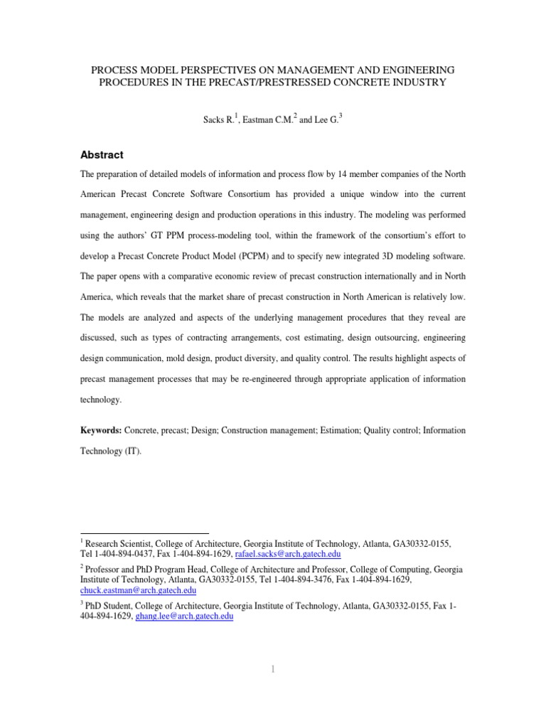 Keywords: Concrete, precast; Design; Construction management; Estimation; Quality control; Information Technology (IT).