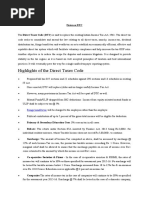 Proposal to raise tax exemption for senior citizens to Rs. 2.5 lakh from Rs. 2.4 lakh currently Corporate tax to remain at 30 per cent but without surcharge and cess MAT to be 20 per cent of book profit, up from 18.5 per cent Proposal to levy dividend distribution tax at 15 per cent Exemption for investment in approved funds and insurance schemes proposed at Rs. 1.5 lakh annually, against Rs. 1.2 lakh currently Proposed bill has 319 sections and 22 schedules against 298 sections and 14 schedules in existing IT Act Once enacted, DTC will replace archaic Income Tax Act.