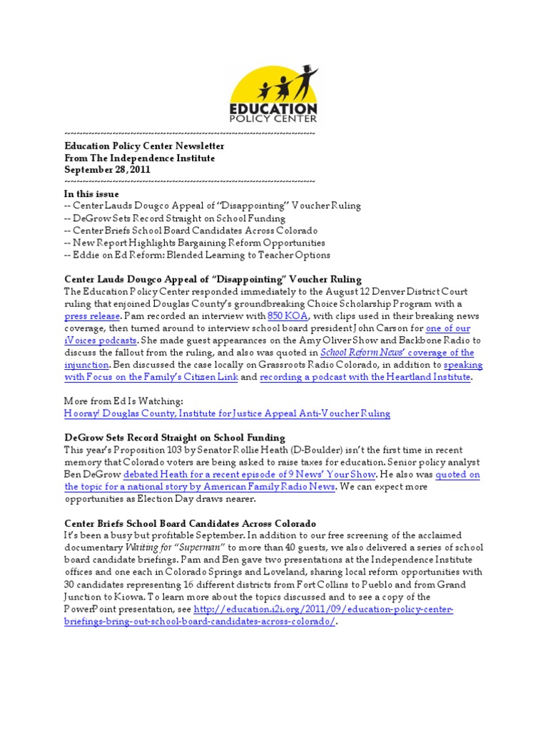 -- Center Lauds Dougco Appeal of Disappointing Voucher Ruling -- DeGrow Sets Record Straight on School Funding -- Center Briefs School Board Candidates Across Colorado -- New Report Highlights Bargaining Reform Opportunities -- Eddie on Ed Reform: Blended Learning to Teacher Options Center Lauds Dougco Appeal of Disappointing Voucher Ruling The Education Policy Center responded immediately to the August 12 Denver District Court ruling that enjoined Douglas Countys groundbreaking Choice Scholarship Program with a press release. Pam recorded an interview with 850 KOA, with clips used in their breaking news coverage, then turned around to interview school board president John Carson for one of our iVoices podcasts. She made guest appearances on the Amy Oliver Show and Backbone Radio to discuss the fallout from the ruling, and also was quoted in School Reform News coverage of the injunction. Ben discussed the case locally on Grassroots Radio Colorado, in addition to speaking with Focus on the Familys Citizen Link and recording a podcast with the Heartland Institute. More from Ed Is Watching: Hooray! Douglas County, Institute for Justice Appeal Anti-Voucher Ruling DeGrow Sets Record Straight on School Funding This years Proposition 103 by Senator Rollie Heath (D-Boulder) isnt the first time in recent memory that Colorado voters are being asked to raise taxes for education. Senior policy analyst Ben DeGrow debated Heath for a recent episode of 9 News Your Show. He also was quoted on the topic for a national story by American Family Radio News. We can expect more opportunities as Election Day draws nearer. Center Briefs School Board Candidates Across Colorado Its been a busy but profitable September. In addition to our free screening of the acclaimed documentary Waiting for Superman to more than 40 guests, we also delivered a series of school board candidate briefings. Pam and Ben gave two presentations at the Independence Institute offices and one each in Colorado Springs and Loveland, sharing local reform opportunities with 30 candidates representing 16 different districts from Fort Collins to Pueblo and from Grand Junction to Kiowa. To learn more about the topics discussed and to see a copy of the PowerPoint presentation, see http://education.i2i.org/2011/09/education-policy-centerbriefings-bring-out-school-board-candidates-across-colorado/.
