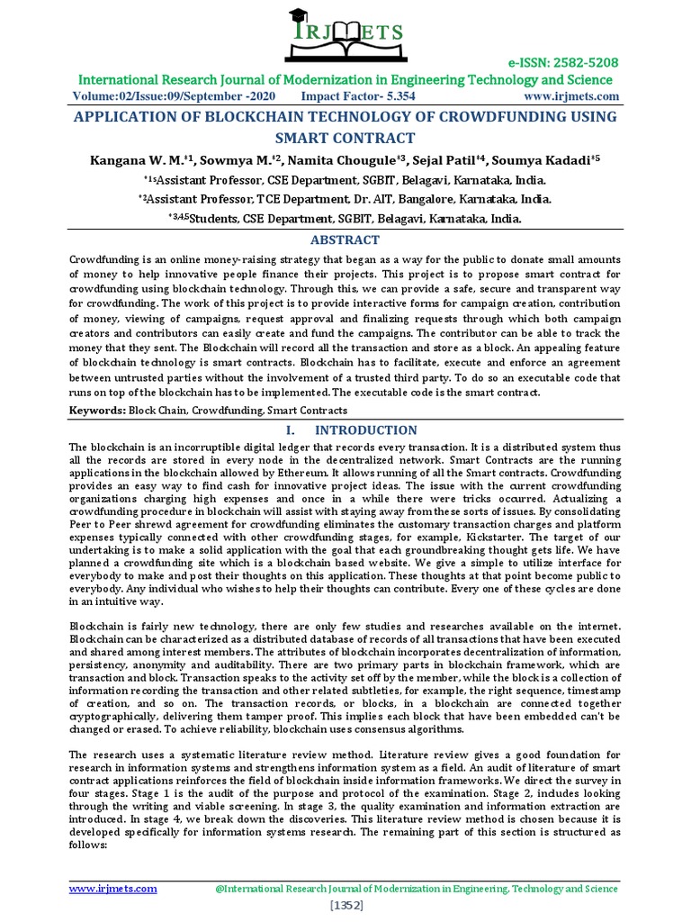 [5] S. Benila, V. Ajay , K. Hrishikesh, R. Karthick , “Crowd Funding using Blockchain”, GRD Journals- Global