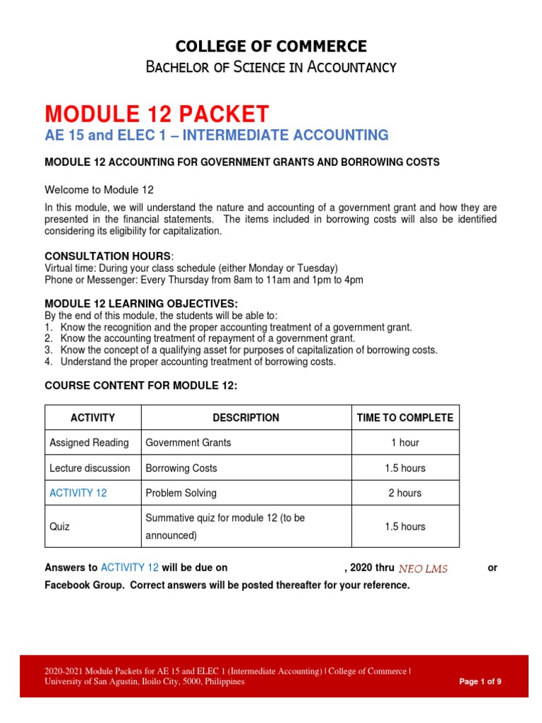 2020-2021 Module Packets for AE 15 and ELEC 1 (Intermediate Accounting) | College of Commerce |