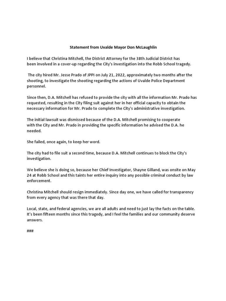 Statement From Uvalde Mayor Don McLaughlin