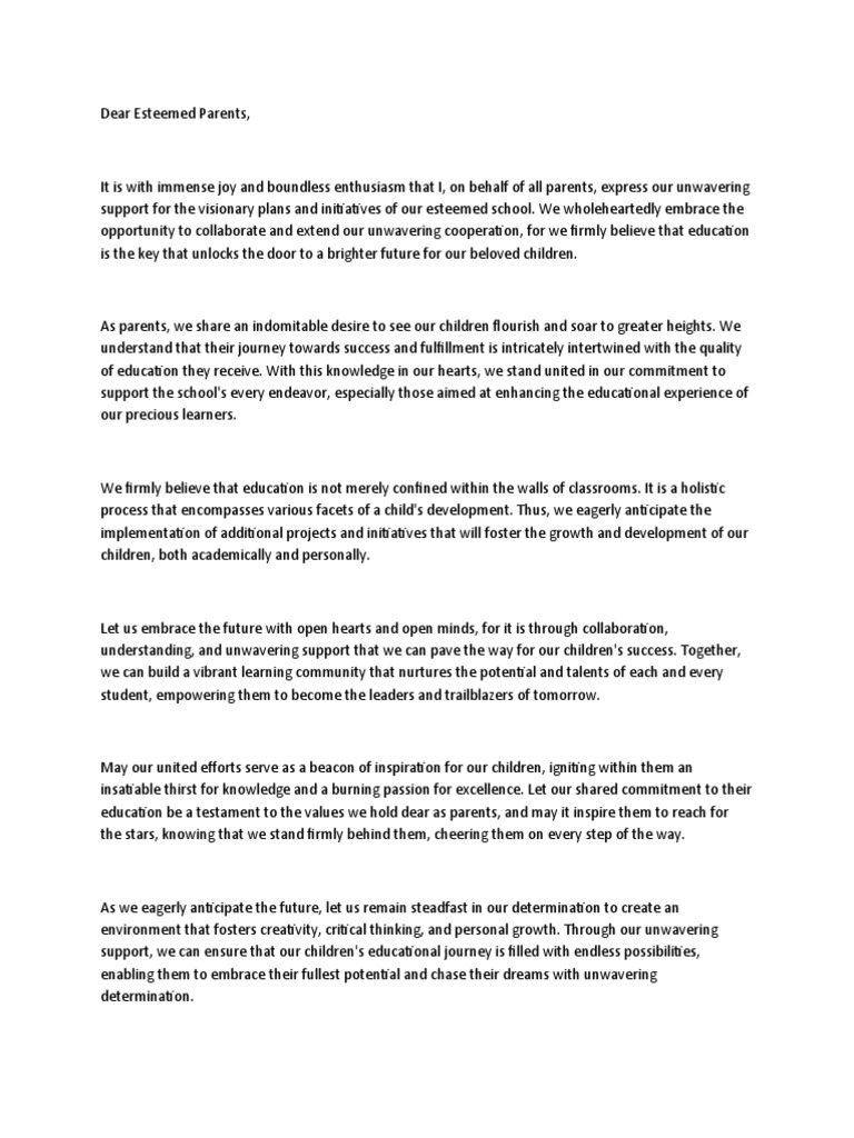 support for the visionary plans and initiatives of our esteemed school. We wholeheartedly embrace the