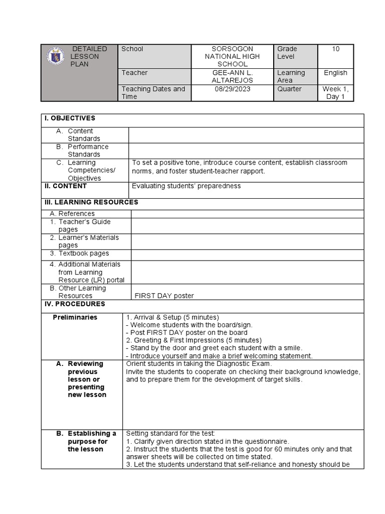 DETAILED School SORSOGON Grade 10