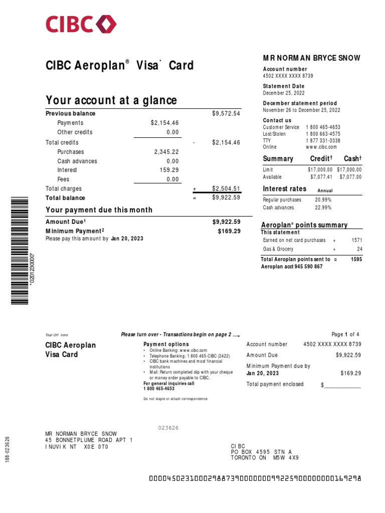 Visa Card • Telephone Banking: 1 800 465-CIBC (2422) Amount Due $9,922.59