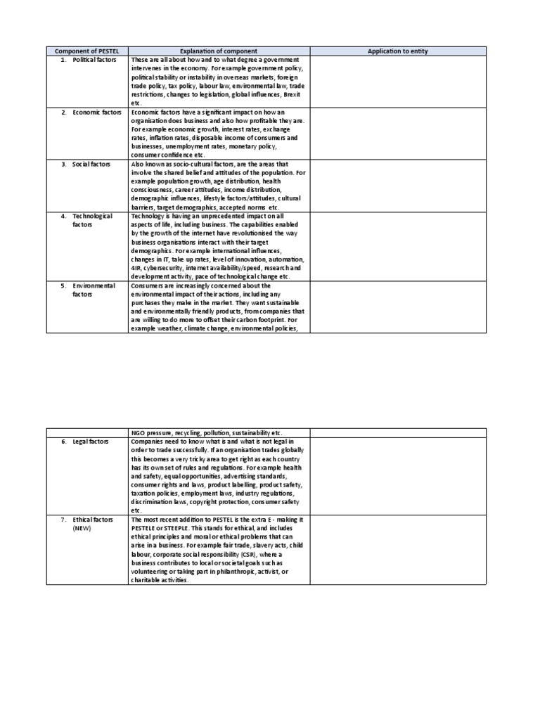 Component of PESTEL Explanation of component Application to entity