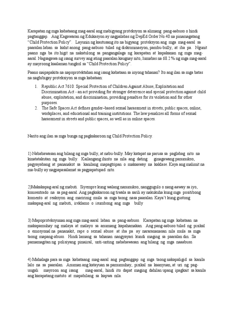“Child Protection Policy”. Layunin ng kautusang ito na bigyang proteksyon ang mga mag-aaral sa