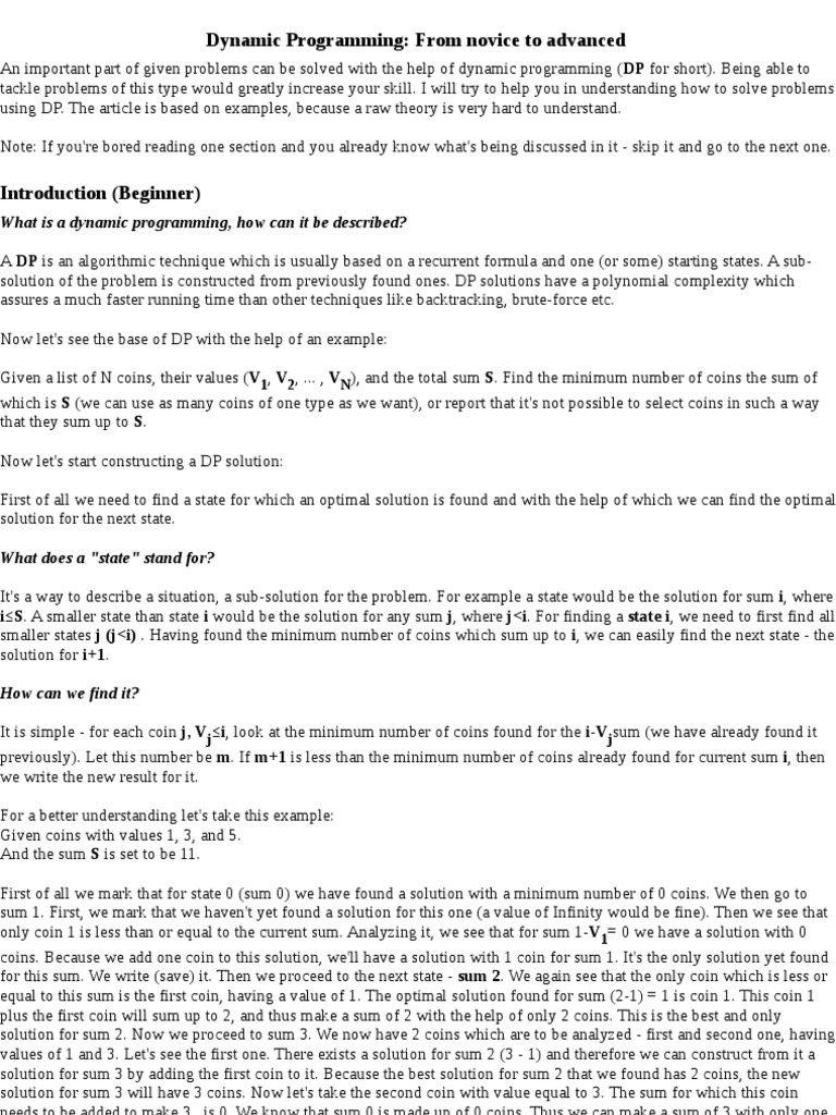 An important part of given problems can be solved with the help of dynamic programming (DP for short). Being able to tackle problems of this type would greatly increase your skill. I will try to help you in understanding how to solve problems using DP. The article is based on examples, because a raw theory is very hard to understand. Note: If you're bored reading one section and you already know what's being discussed in it - skip it and go to the next one.
