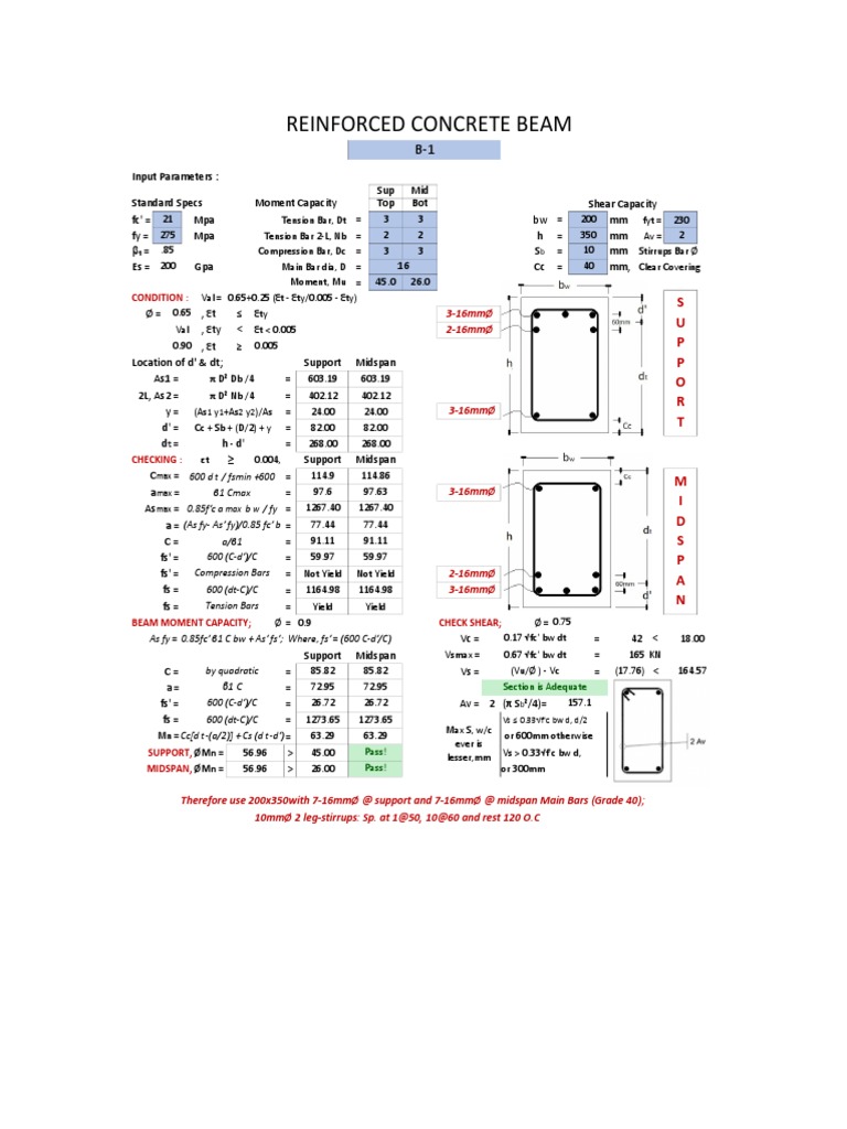 Therefore use 200x350with 7-16mmØ @ support and 7-16mmØ @ midspan Main Bars (Grade 40);
