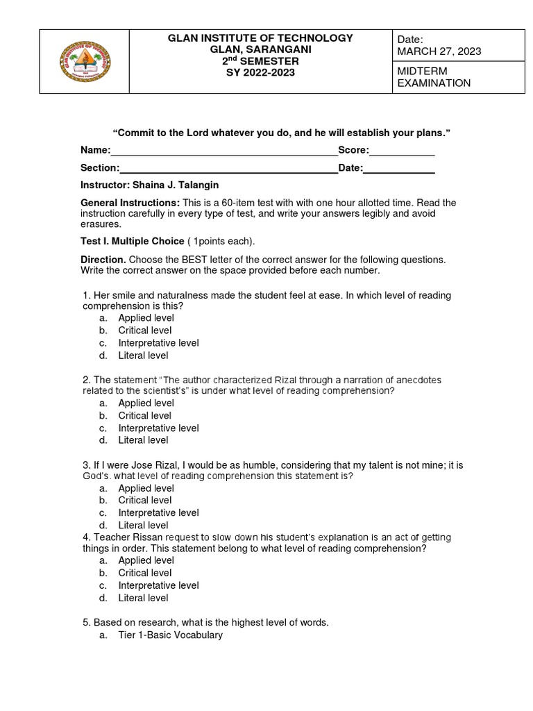 General Instructions: This is a 60-item test with with one hour allotted time. Read the