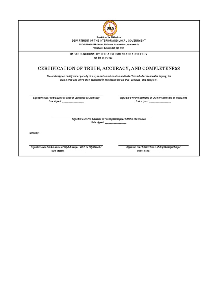 CERTIFICATION OF TRUTH, ACCURACY, AND COMPLETENESS