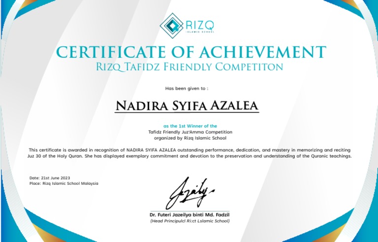 This certificate is awarded in recognition of NADIRA SYIFA AZALEA outstanding performance, dedication, and mastery in memorizing and reciting